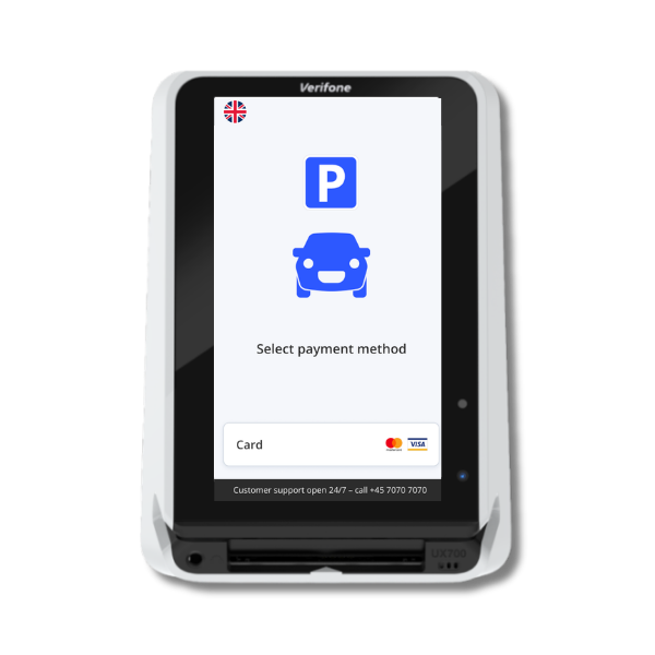 Pienikokoinen OPT/IPT-maksupääte, jossa mahdollisuus vaakasuoraan pöytäasennukseen.