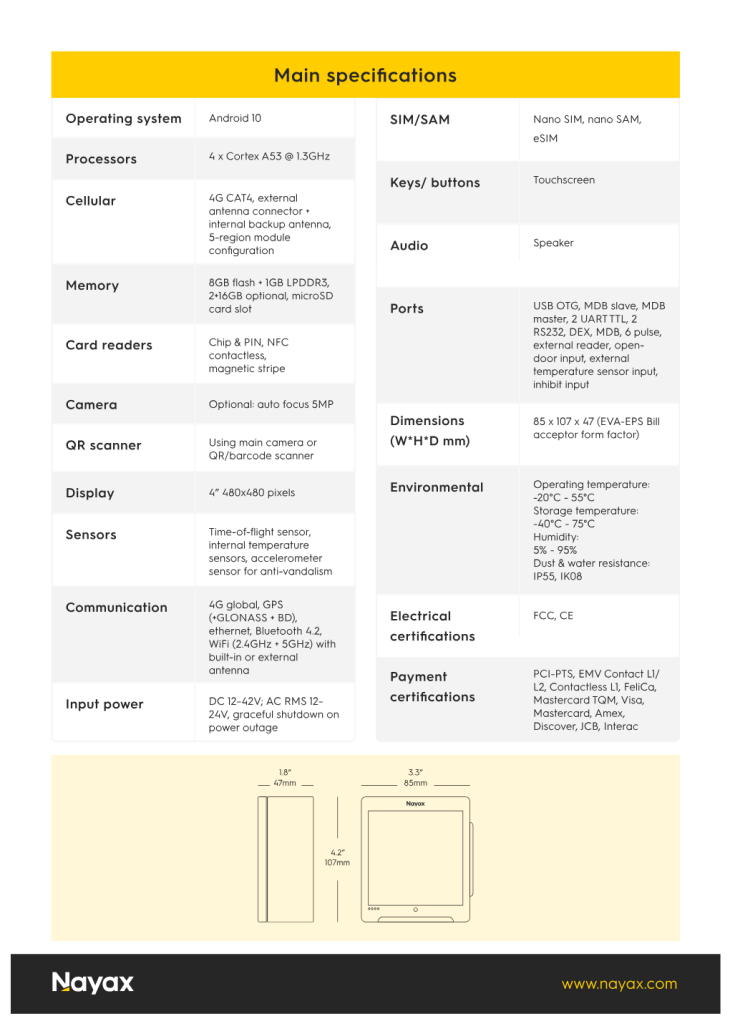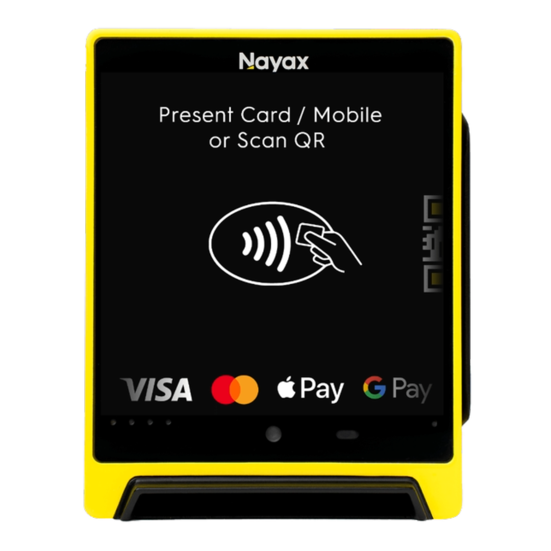 Nayax-maksupäätteet ovat helppokäyttöisiä ja tehokkaita kortinlukijoita, jotka hyväksyvät yli 80 eri maksutapaa, kuten pankki- ja luottokortit, mobiilimaksut, QR-koodit ja prepaid-kortit.